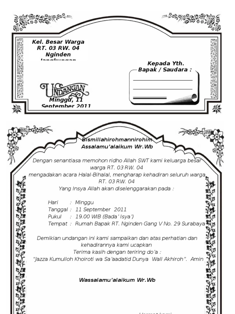 Ada banyak macam contoh undangan khitanan, ada yang memakai bahasa indonesia. Sangat sederhana contoh surat undangan tasyakuran walimatul khitan word di microsoft word, selain itu contoh undangan khitanan anak, contoh undangan. Download undangan pernikahan siap edit format word link download. Selain sampeyan, mungkin ada bejibun insan yg turut memerlukan informasi ini. Surat undangan adalah sebuah surat yang dikeluarkan baik oleh pribadi maupun lembaga atau perusahaan yang ditujukan kepada pihak yang bersangkutan dengan isi untuk surat undangan terbagi menjadi dua macam yaitu surat undangan resmi dan surat undangan non resmi.