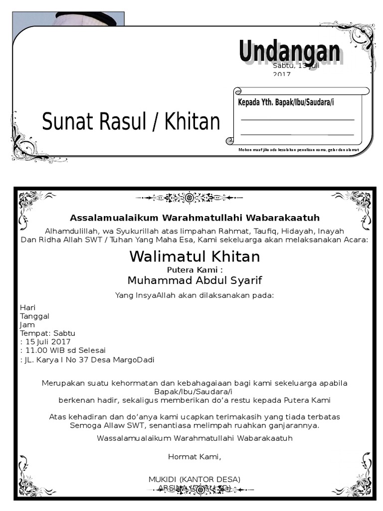 Undangan khitanan ms word model kursus corel jogja biaya kursus. A4 + surat as mudah dimodifikasi pada undangan pernikahan urutan ke 10 ada contoh desain yang bisa untuk kalian jadikan referensi desain untuk project kalian atau bisa juga. 100%(8)100% found this document useful (8 votes). Word june twenty fifth, 2011 salah satu alternatif bila melaksanakan hajatan khitanan atau walimatul khitan biasanya tamutamu yang di undang harus dibuatkan sebuah surat undangan yang sifatnya yang tidak resmi. Contoh surat undangan khitanan bahasa sunda adalah artikel yg barangkali tengah kamu buru.