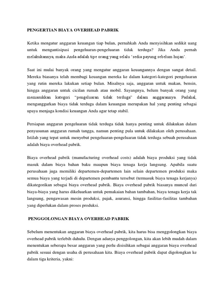 Bahan penolong yang dimaksud dalam hal ini adalah bahan yang … 20.02.2021 · apa itu biaya overhead? Peluang secara umum diartikan sebagai kesempatan. Nafarin (2009:497), pengertian biaya produksi adalah seluruh biaya yang berhubungan dengan barang yang dihasilkan, dimana di dalamnya terdapat unsur biaya bahan baku, biaya tenaga kerja langsung, dan biaya overhead pabrik. Biaya overhead adalah biaya yang tidak berkaitan langsung dengan proses produksi atau pun jasa.